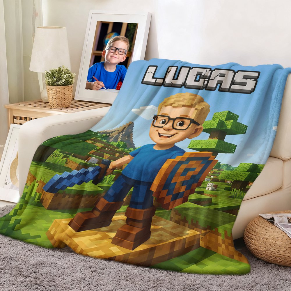 Questa coperta trasforma i bambini o i giocatori nell'eroe della loro storia nel mondo dei pixel. È possibile caricare una foto chiara e inserire un nome. Il sistema fonde la foto in un personaggio in stile pixel (completo di spada/scudo e scenario di gioco a blocchi) e aggiunge il nome in una tipografia audace e a tema, trasformando una normale coperta in un ricordo "avatar del giocatore" unico nel suo genere.