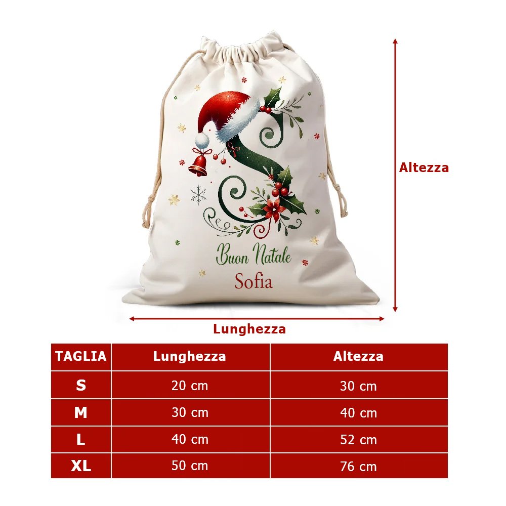 Rendi unico il tuo sacco di Babbo Natale personalizzando le iniziali con un piccolo dettaglio a campanella e il nome che desideri. Ogni sacco diventa così un gesto sincero d’amore. Disponibile in quattro misure, si distingue dal classico packaging. Che sia per i tuoi bambini o per le persone che ami, questo tocco personale trasmette un sentimento natalizio davvero speciale.