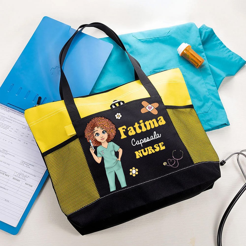 Borsa personalizzata con personaggio animato e nome, tessuto Oxford con tasca a rete - Regalo per infermiere o personale medico